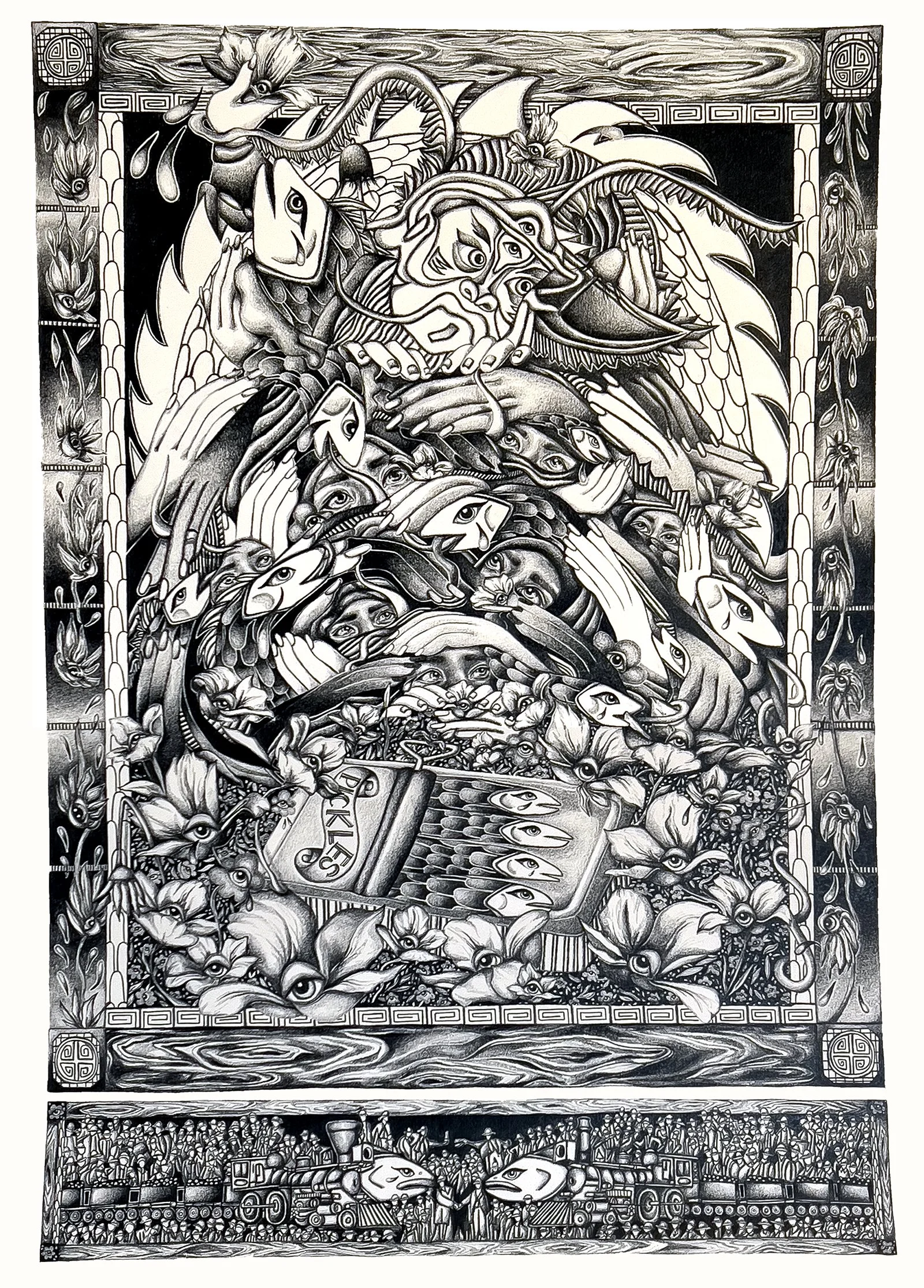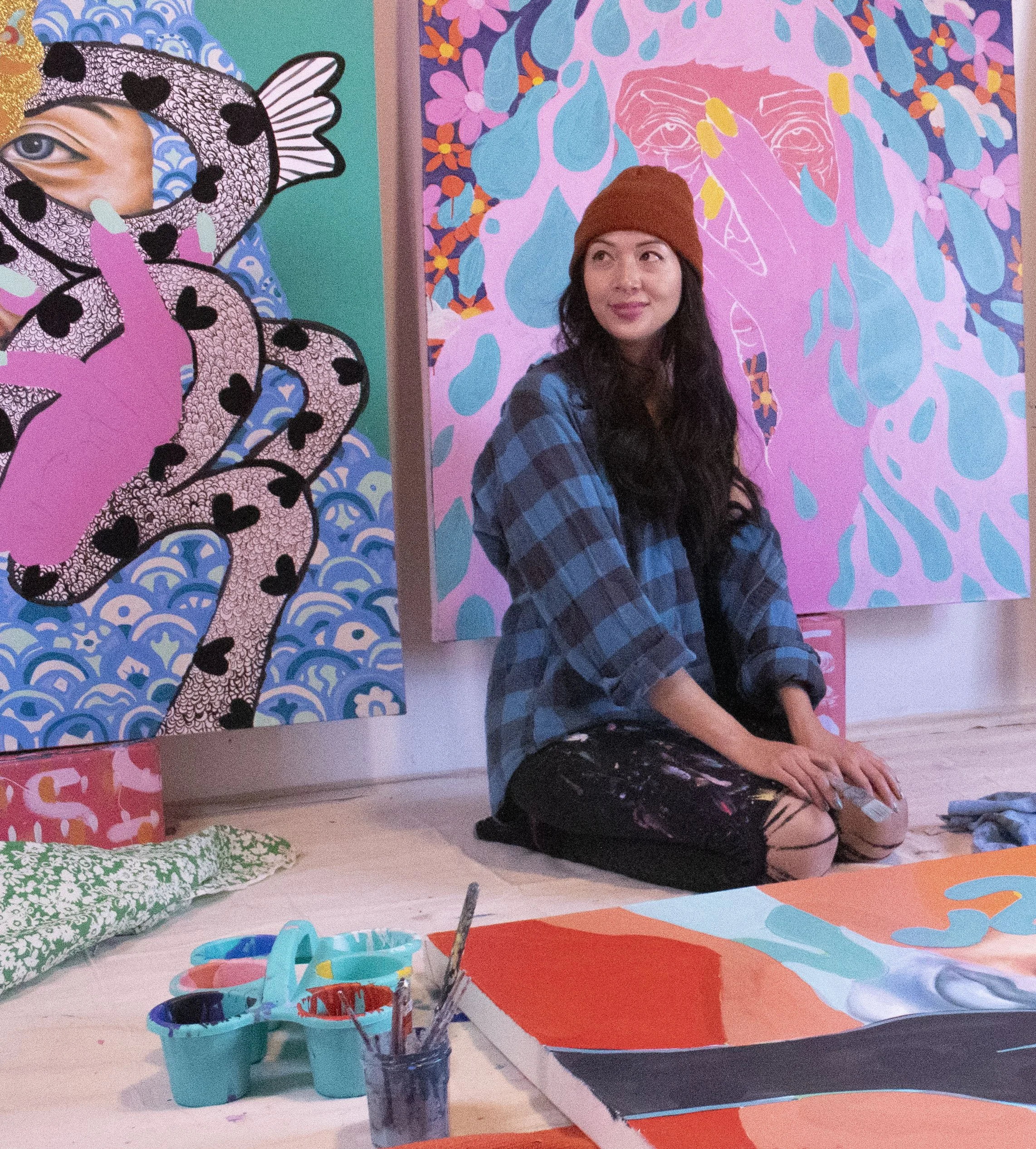 Caroline Liu is a multidisciplinary artist whose work spans various mediums, including painting, drawing, fiber art, and murals. She is known for her exploration of decadent and dark surrealism, intricately weaving together realistic and illustrative motifs to create densely packed magical environments that blur the boundaries between light and dark, real and imagined. Inspired by her own memories, nostalgia, culture, and identity, Liu reflects on the complexities of the human experience, inviting viewers into rich, immersive worlds that spark conversations around grief and joy, love and loss, chaos and meditation. Her work evokes a sense of familiarity and curiosity, inviting viewers to jump into her visual narratives and breathe in the magic around them.