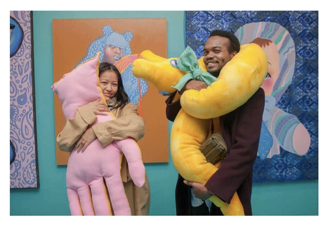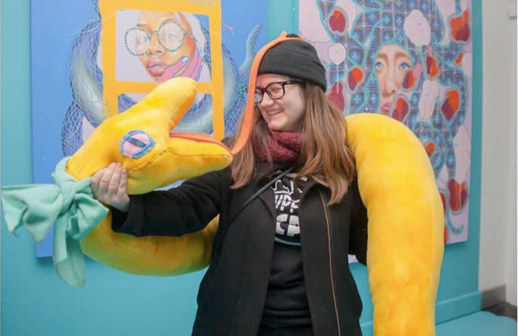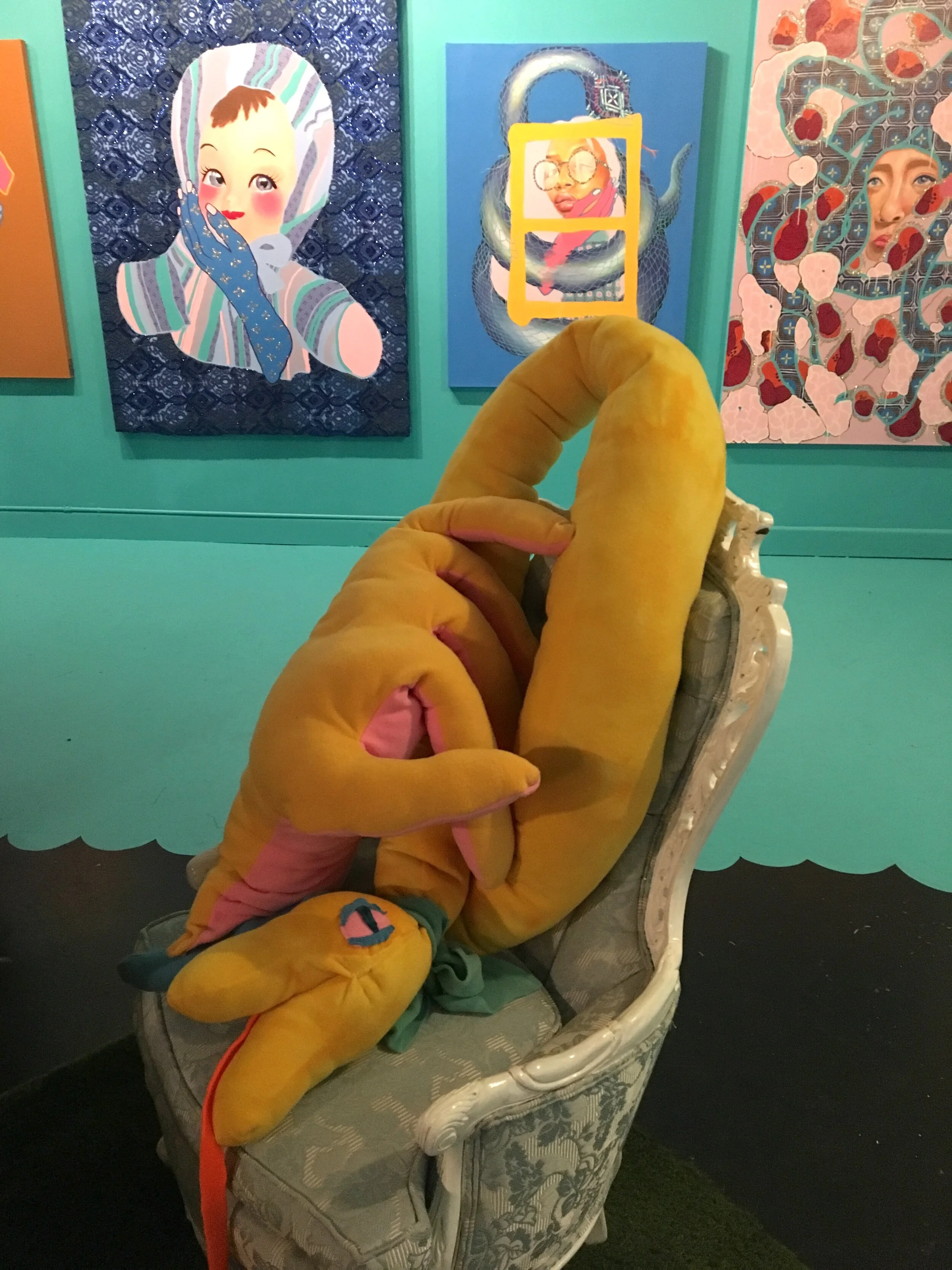 a 10 ft long bright yellow danger noodle weighted soft sculpture with a MOUTH that loves to eat
