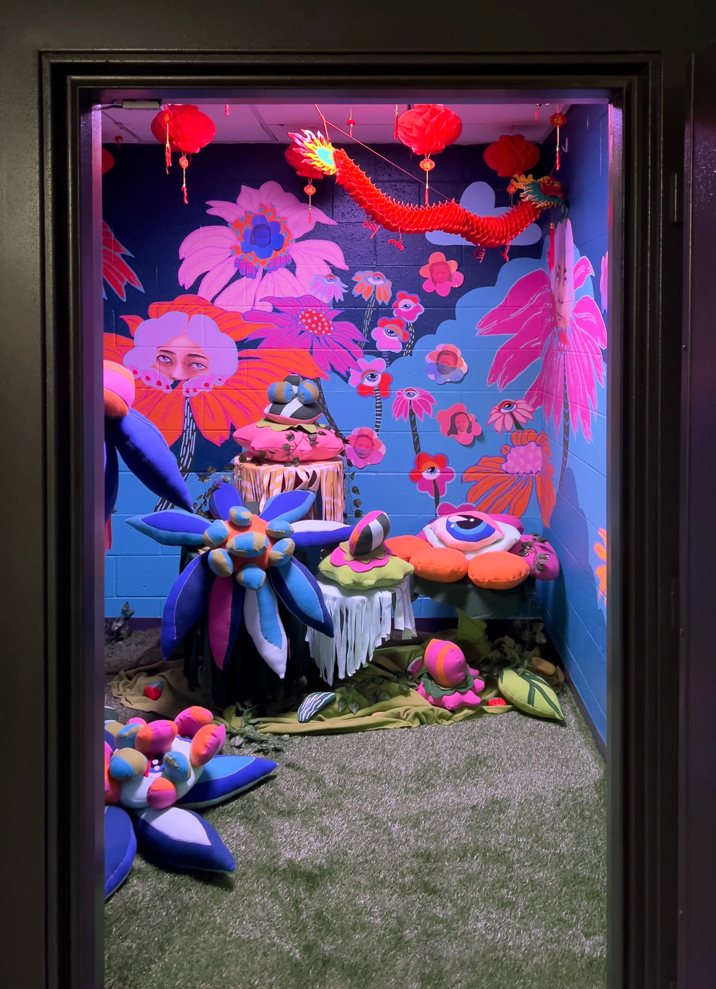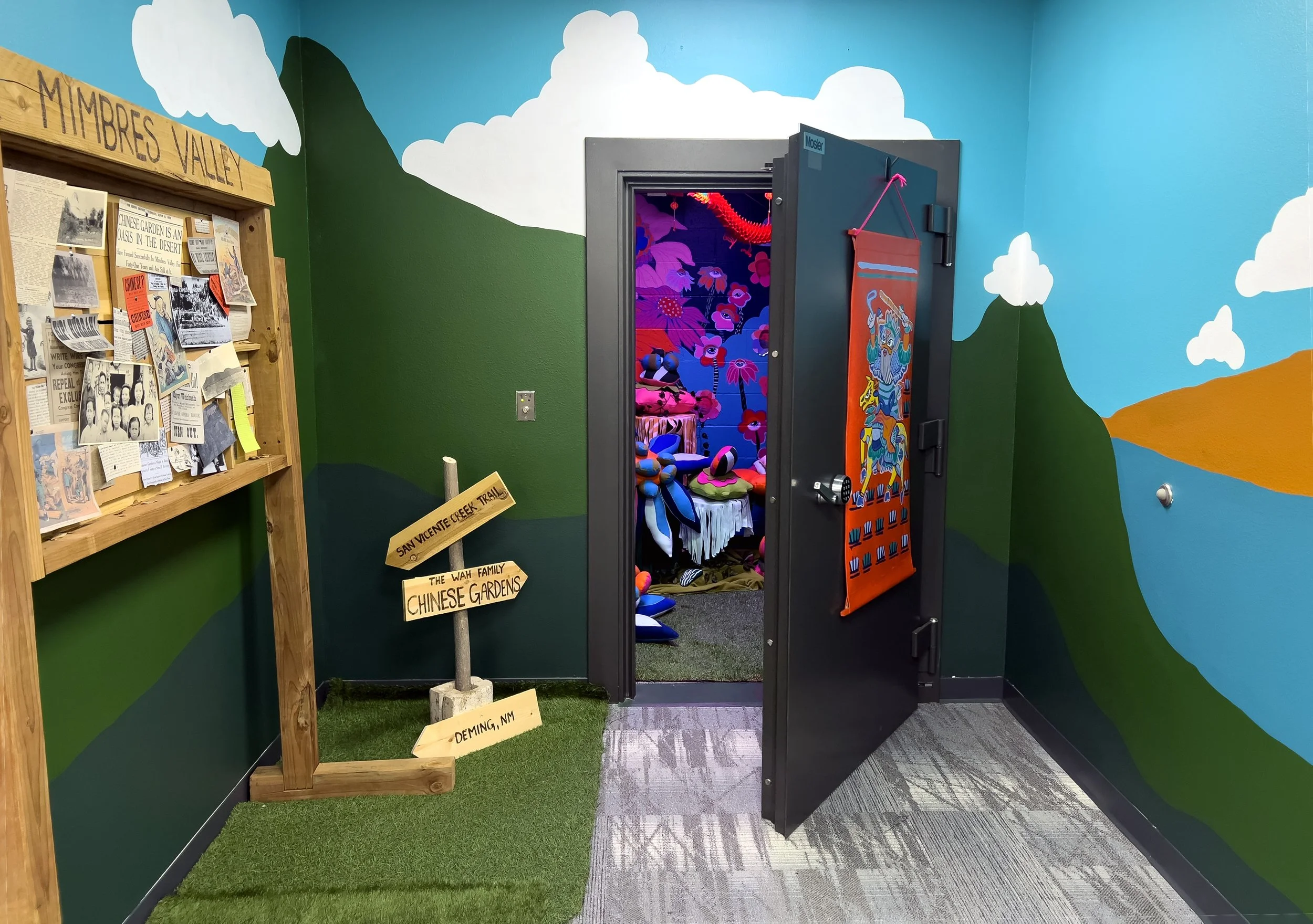Visitors are invited to look through news articles and documents posted on the trailhead board to uncover the code to open the door to a vibrant, imaginative garden protected with Menshen, traditional Chinese Deities that protect inhabitants from any harm and encourage positive spirits to enter.